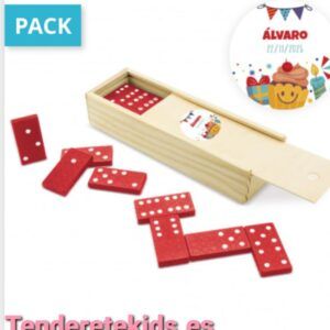 Dominó de piezas rojas en estuche de madera personalizado con adhesivo de cumpleaños
