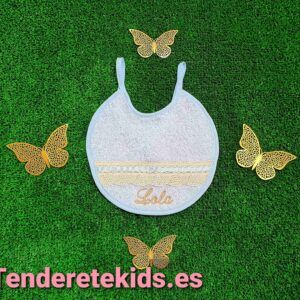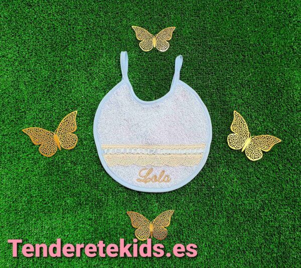 Babero celeste de encaje camel con filos celeste personalizable con nombre