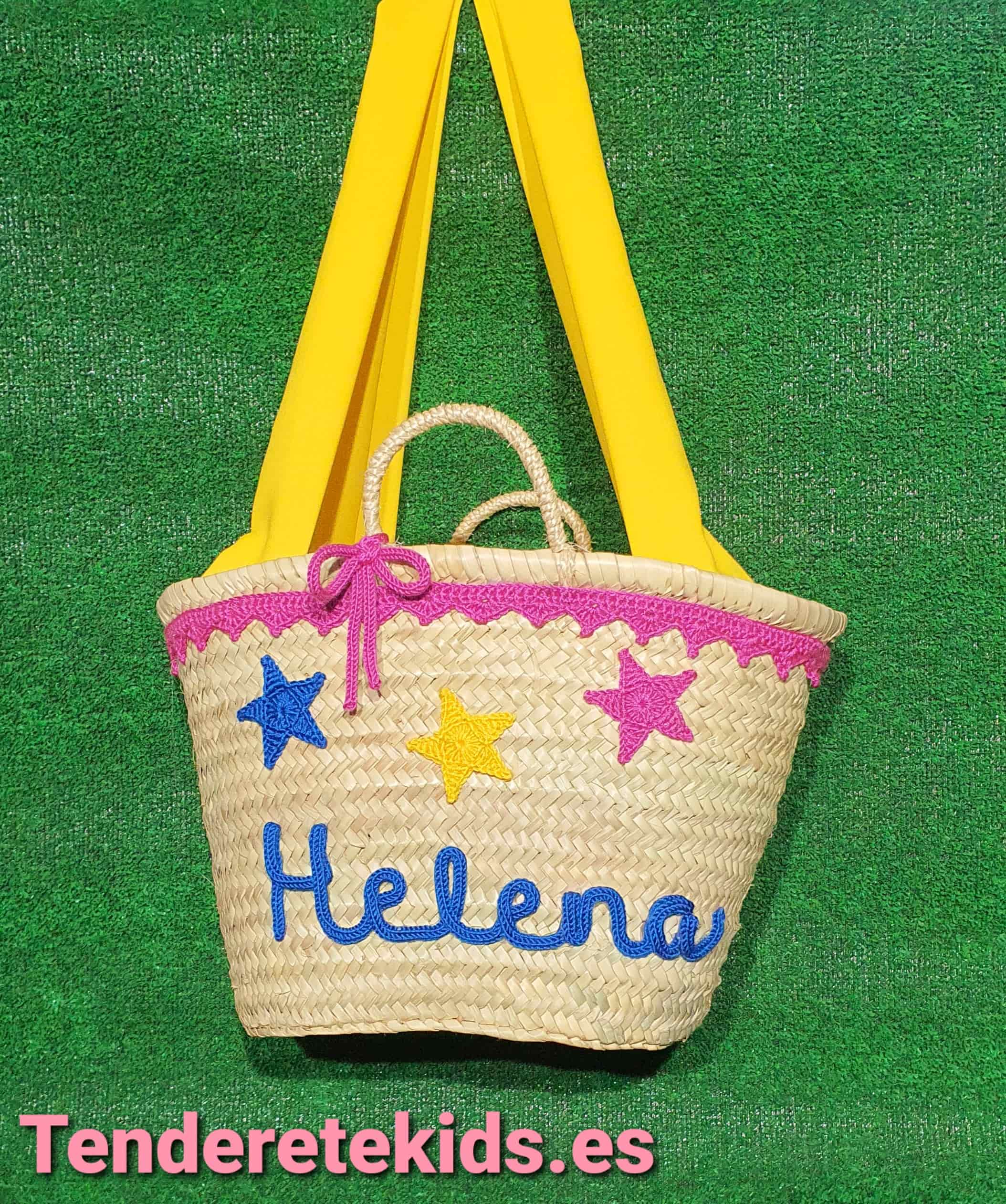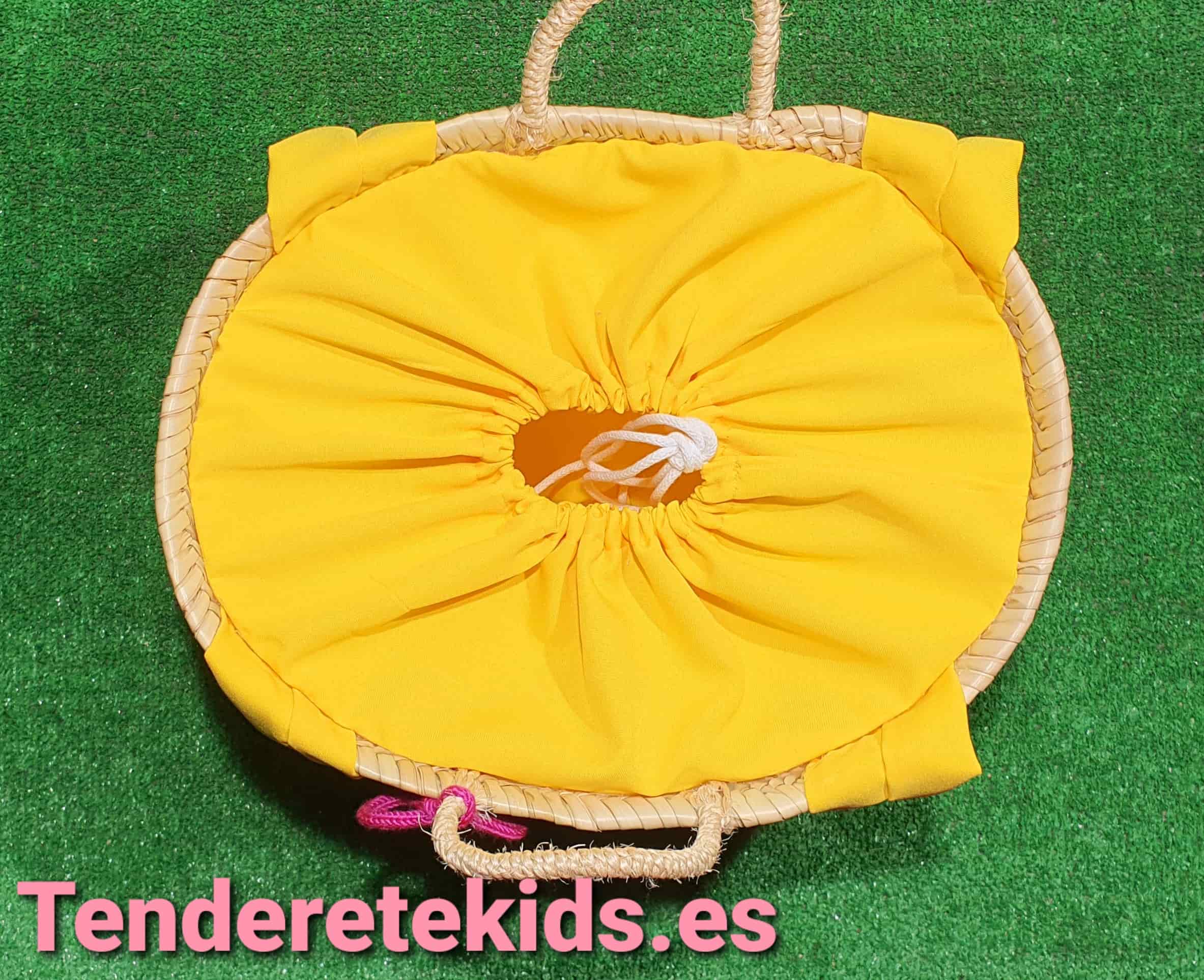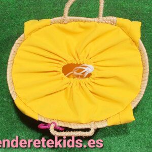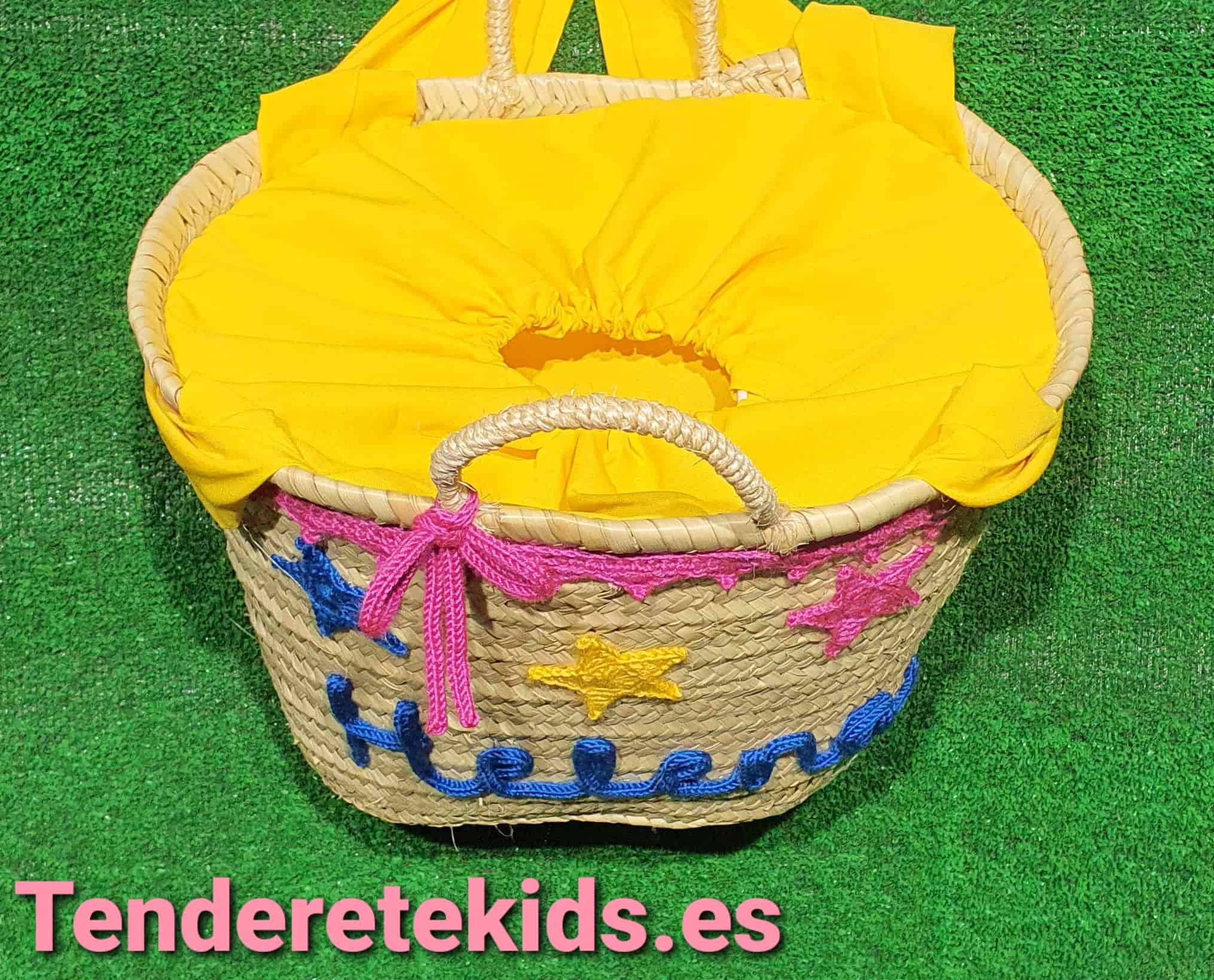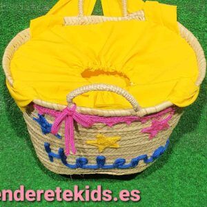 Capazo mediano personalizado interior forrado con cierre y asas de tela amarilla con cordoncillo y estrellas con nombre