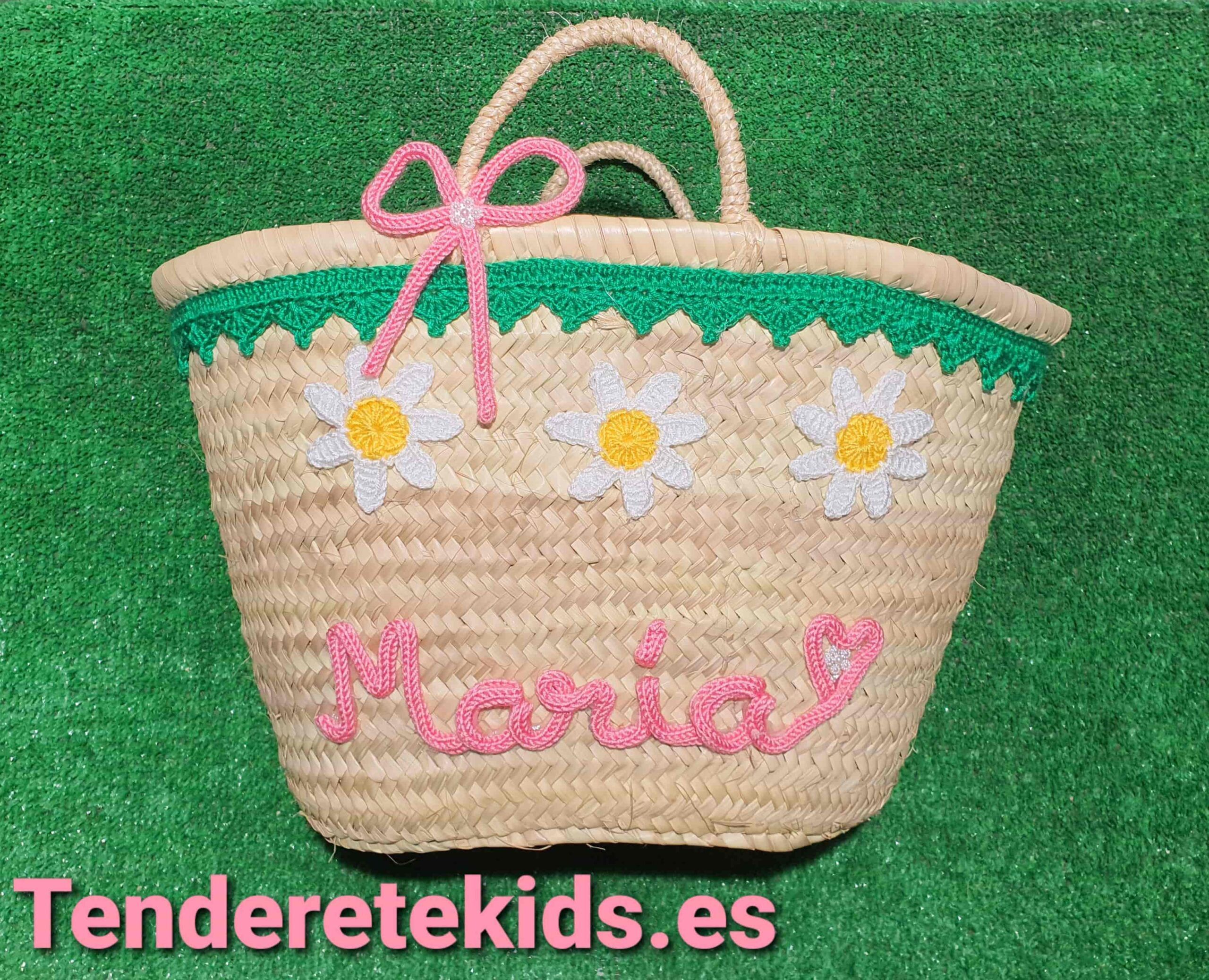 Cesta mediana de cordoncillo verde con margaritas personalizado con nombre