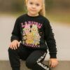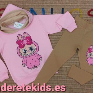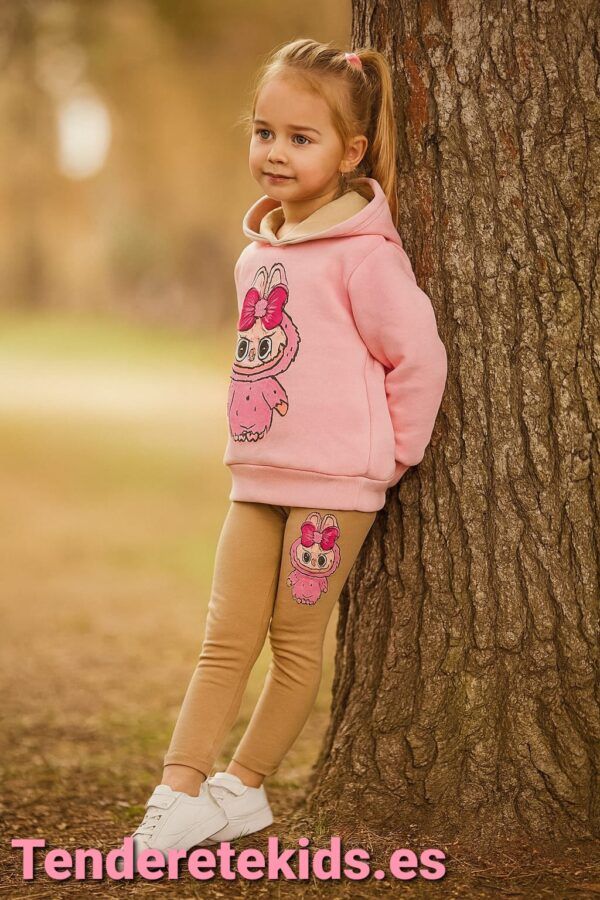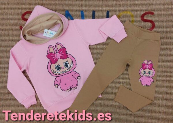 Chandal Labubu con sudadera de capucha rosa y leggins camel