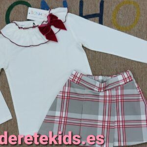 Conjunto camiseta marfi de cuello volante con lazada roja y falda cuadros