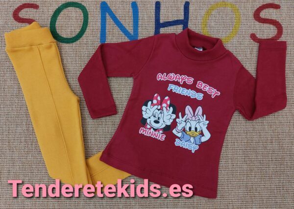 Conjunto friends con camiseta semicisne polar burdeo y leggins polar mostaza