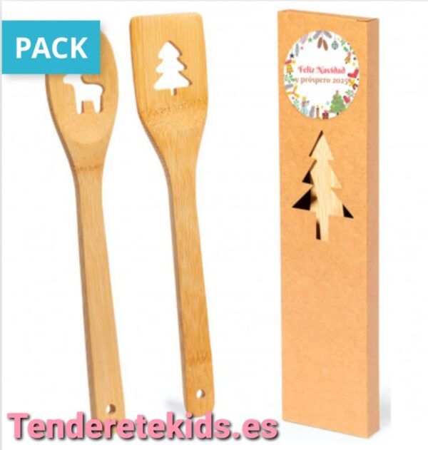 Cuchara y espátula de bambú con decoraciones navideñas presentada en caja navideña con adhesivo personalizable para detalles