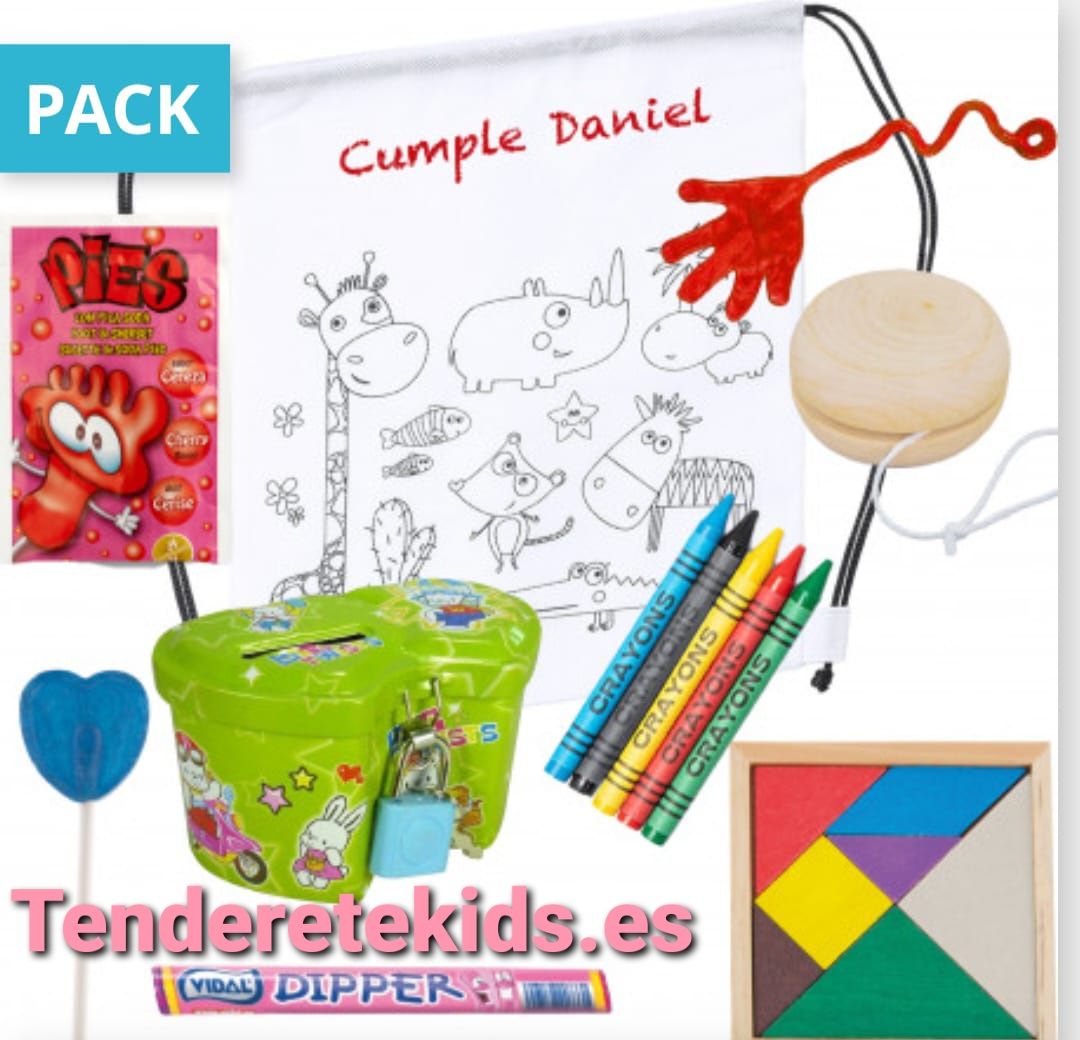 Sorprende con estos detalles originales para niños: mochila para colorear, tangram, hucha, mano loca, yoyó y golosinas sin gluten.