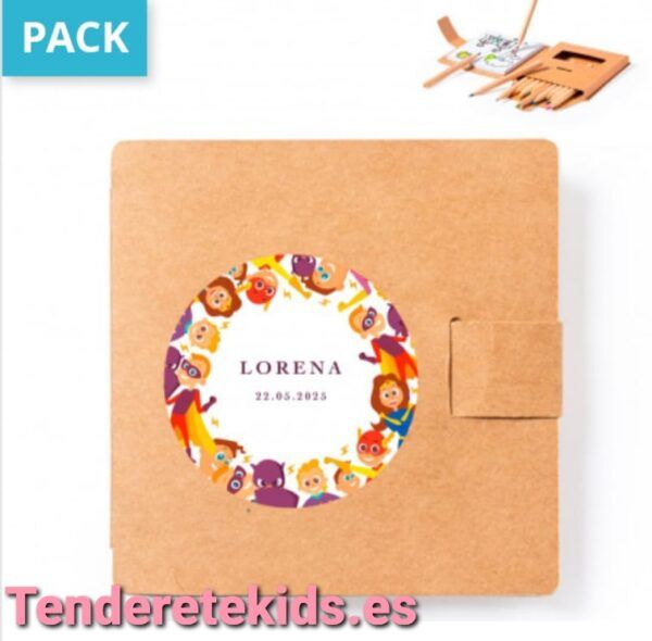 Estuche con hojas y lápices para colorear con adhesivo superhéroes para regalar