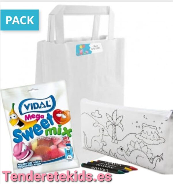 Estuche para colorear y chuches en bolsa personalizada con adhesivo infantil