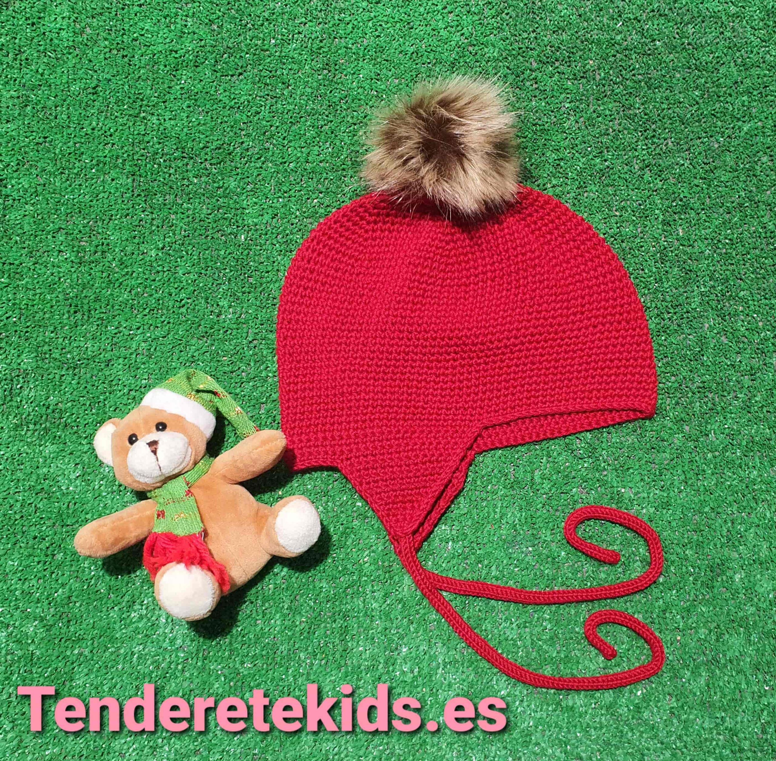 Gorro de lana burdeos modelo cubre orejas con ponpon de pelo lobo