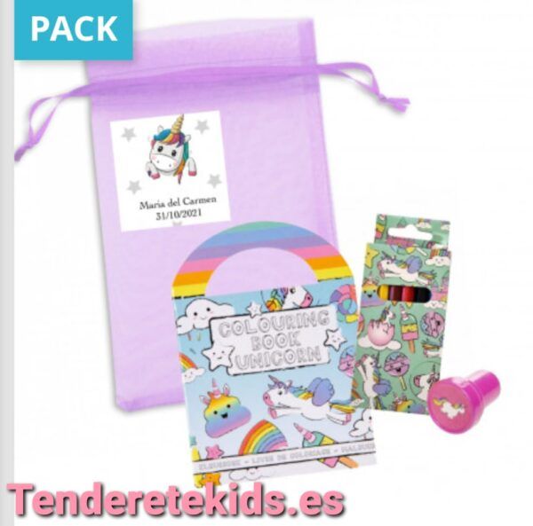 Libro de colorear con pegatinas caja de lápices y sello de unicornio en bolsa de organza con adhesivo para detalle infantil