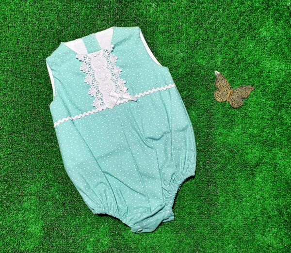 Pelele verde agua estampado topo con encaje y lazo blanco