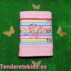 Toalla rosa bebé con banda de tela estampado rayas de colores minnie personalizable con nombre
