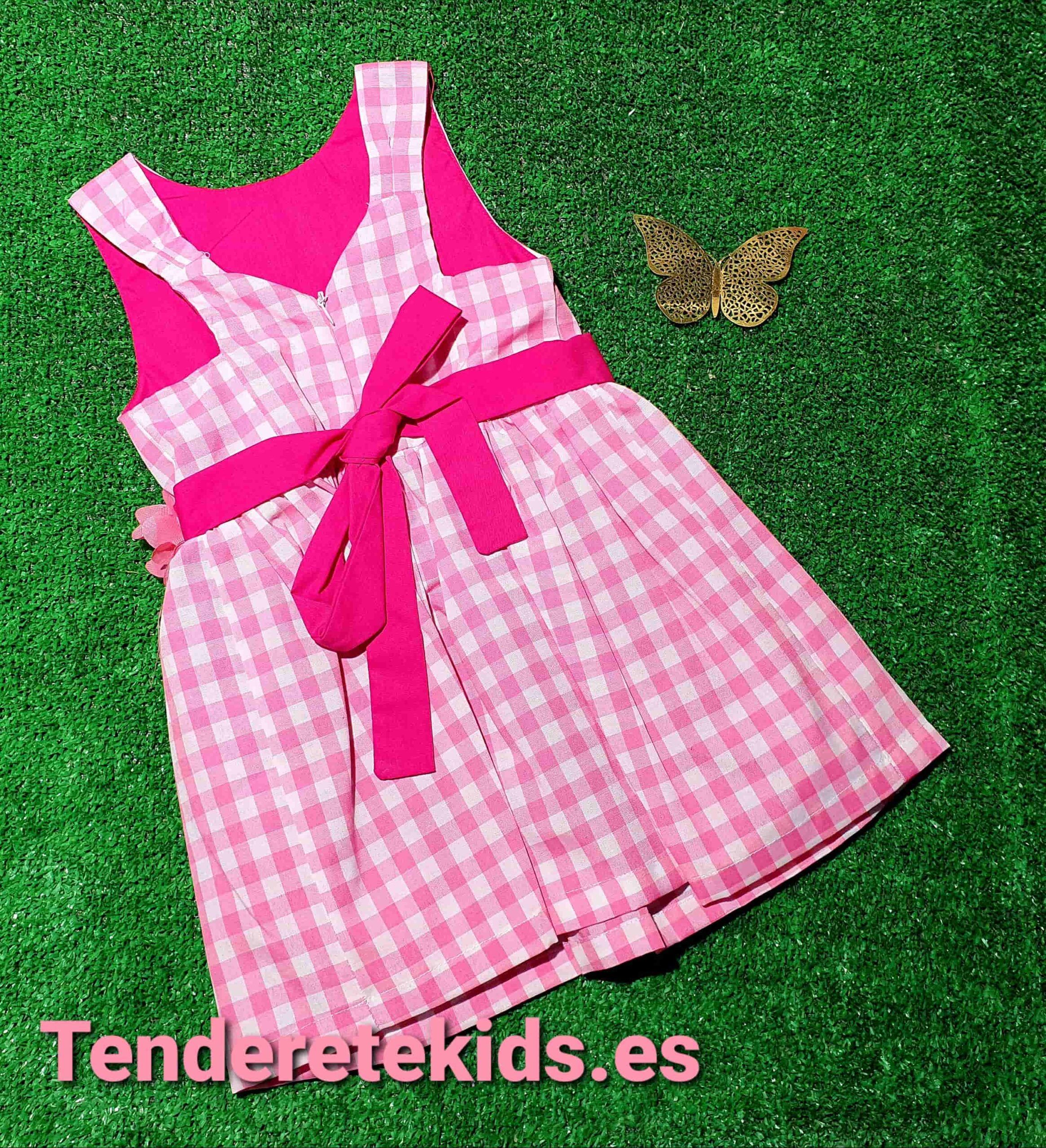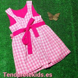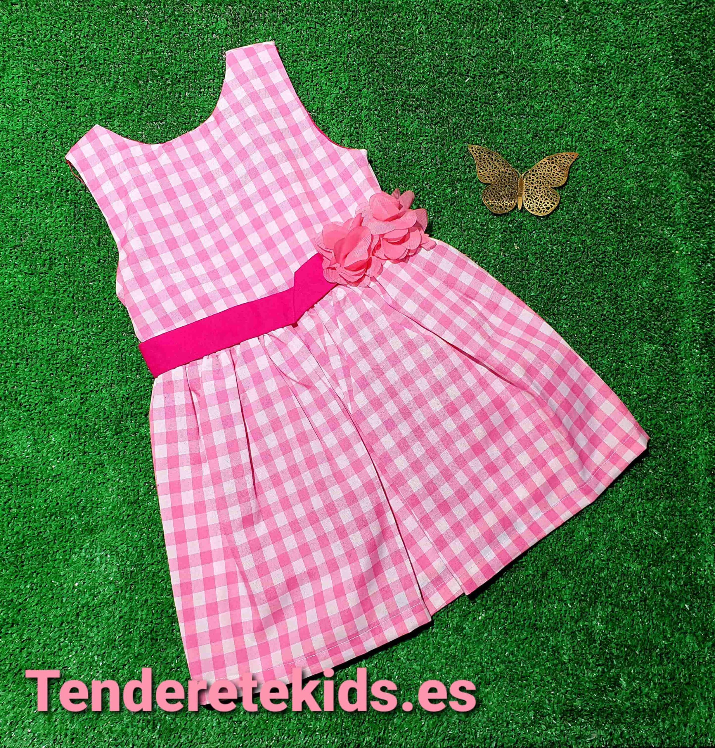Vestido de tirante vichy rosa fuscia con cinturón decorado con florecitas